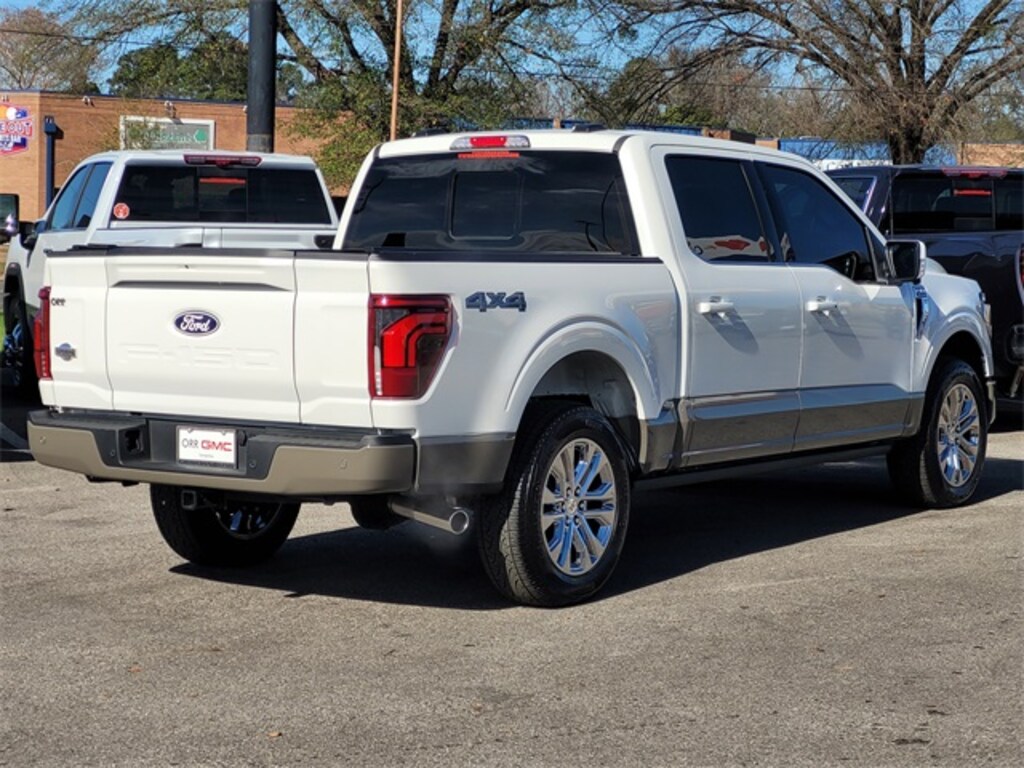 This 2025 Ford F-150 comes equipped with Equipment Group 601A High, 4WD, Navigation system: Connected Navigation, 14 Speakers, 4-Wheel Disc Brakes, ABS brakes, Adjustable pedals, Air Conditioning, Alloy wheels, AM/FM radio: SiriusXM with 360L, Auto High-beam Headlights, Auto tilt-away steering wheel, Auto-dimming door mirrors, Auto-dimming Rear-View mirror, Automatic temperature control, Brake assist, Chrome wheels, Compass, Delay-off headlights, Driver door bin, Driver vanity mirror, Dual front impact airbags, Dual front side impact airbags, Electronic Locking w/3.55 Axle Ratio, Electronic Stability Control, Emergency communication system: SYNC 4 911 Assist, Front anti-roll bar, Front Bucket Seats, Front Center Armrest, Front dual zone A/C, Front fog lights, Front License Plate Bracket, Front reading lights, Front wheel independent suspension, Fully automatic headlights, Garage door transmitter, Genuine wood dashboard insert, Heads-Up Display, Heated door mirrors, Heated front seats, Heated rear seats, Heated steering wheel, Illuminated entry, King Ranch Multicontour Leather Bucket Seats, Leather steering wheel, Low tire pressure warning, Memory seat, Occupant sensing airbag, Outside temperature display, Overhead airbag, Overhead console, Panic alarm, Passenger door bin, Passenger vanity mirror, Pedal memory, Power door mirrors, Power driver seat, Power moonroof, Power passenger seat, Power steering, Power windows, Radio data system, Radio: B&O Unleashed Sound System by Bang & Olufsen, Rain sensing wipers, Rear reading lights, Rear seat center armrest, Rear step bumper, Rear window defroster, Remote keyless entry, Security system, Speed control, Split folding rear seat, Steering wheel memory, Steering wheel mounted audio controls, SYNC 4 w/Enhanced Voice Recognition, Tachometer, Telescoping steering wheel, Tilt steering wheel, Tough Bed Spray-In Bedliner, Traction control, Trip computer, Turn signal indicator mirrors, Variably intermittent wipers, Ventilated front seats, Voltmeter, and Wheels: 20" Chrome-Like PVD. CARFAX One-Owner. 4WD, Equipment Group 601A High, Navigation system: Connected Navigation.