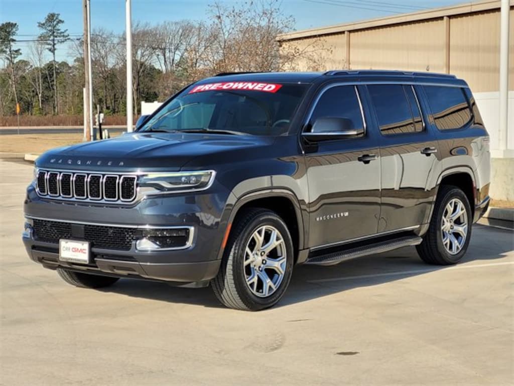 This 2022 Jeep Wagoneer comes equipped with Premium Group I (DISC) (3 Panel Sunroof, Adjustable Roof Rail Crossbars, Bridgestone Brand Tires, Cargo Cover, Reversible Carpet/Vinyl Cargo Mat, and Wheels: 20 x 9.0 Aluminum Base Finish (DISC)), Quick Order Package 22E, Navigation System, 10 Speakers, 3.21 Rear Axle Ratio, 3rd row seats: bench, 4-Wheel Disc Brakes, ABS brakes, Adjustable pedals, Air Conditioning, Alloy wheels, AM/FM radio: SiriusXM with 360L, Anti-whiplash front head restraints, Audio memory, Auto-dimming door mirrors, Auto-dimming Rear-View mirror, Auto-leveling suspension, Automatic temperature control, Brake assist, Bumpers: body-color, Compass, Delay-off headlights, Driver door bin, Driver vanity mirror, Driver's Seat Mounted Armrest, Dual front impact airbags, Dual front side impact airbags, Electronic Stability Control, Exterior Parking Camera Rear, Four wheel independent suspension, Front anti-roll bar, Front Bucket Seats, Front Center Armrest w/Storage, Front dual zone A/C, Front fog lights, Front Passenger Interactive Display, Front reading lights, Fully automatic headlights, Garage door transmitter, Heated door mirrors, Heated front seats, Heated steering wheel, Illuminated entry, Knee airbag, Leather Trimmed Bucket Seats, Low tire pressure warning, Memory seat, Normal Duty Suspension, Occupant sensing airbag, Outside temperature display, Overhead airbag, Overhead console, Panic alarm, Passenger door bin, Passenger seat mounted armrest, Passenger vanity mirror, Pedal memory, Power adjustable front head restraints, Power door mirrors, Power driver seat, Power Liftgate, Power passenger seat, Power steering, Power windows, Radio data system, Radio: Uconnect 5 Nav w/10.1 Display, Rear air conditioning, Rear anti-roll bar, Rear dual zone A/C, Rear reading lights, Rear seat center armrest, Rear window defroster, Rear window wiper, Reclining 3rd row seat, Remote keyless entry, Security system, Speed control, Speed-sensing steering, Speed-Sensitive Wipers, Split folding rear seat, Steering wheel memory, Steering wheel mounted audio controls, Tachometer, Telescoping steering wheel, Tilt steering wheel, Traction control, Trip computer, Turn signal indicator mirrors, Variably intermittent wipers, Ventilated front seats, Voltmeter, and Wheels: 18 x 8.0 Aluminum Base Finish. CARFAX One-Owner. Carfax no accidents, 3 Panel Sunroof, Adjustable Roof Rail Crossbars, Bridgestone Brand Tires, Cargo Cover, Navigation System, Premium Group I (DISC), Quick Order Package 22E, Reversible Carpet/Vinyl Cargo Mat, Wheels: 20 x 9.0 Aluminum Base Finish (DISC).