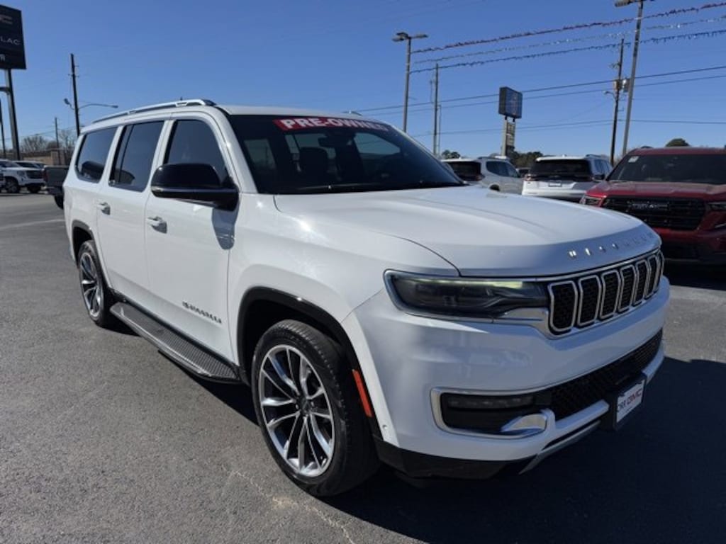 This 2023 Jeep Wagoneer L comes equipped with Flexible Seating Group (7-Passenger Seating, Floor Console w/Cupholder, and Power Tip/Slide Recline 2nd Row Buckets), Premium Group I (3 Panel Sunroof, Adjustable Roof Rail Crossbars, and Reversible Carpet/Vinyl Cargo Mat), Quick Order Package 25J, Navigation System, 10 Speakers, 3.55 Rear Axle Ratio, 3rd row seats: bench, 4-Wheel Disc Brakes, ABS brakes, Adjustable pedals, Air Conditioning, Alloy wheels, AM/FM radio: SiriusXM with 360L, Anti-whiplash front head restraints, Audio memory, Auto-dimming door mirrors, Auto-dimming Rear-View mirror, Auto-leveling suspension, Automatic temperature control, Brake assist, Bumpers: body-color, Compass, Delay-off headlights, Driver door bin, Driver vanity mirror, Driver's Seat Mounted Armrest, Dual front impact airbags, Dual front side impact airbags, Electronic Stability Control, Emergency communication system: Automatic SOS Call, Exterior Parking Camera Rear, Four wheel independent suspension, Front anti-roll bar, Front Bucket Seats, Front Center Armrest w/Storage, Front dual zone A/C, Front fog lights, Front reading lights, Fully automatic headlights, Garage door transmitter, Genuine wood console insert, Genuine wood dashboard insert, Genuine wood door panel insert, Heated door mirrors, Heated front seats, Heated steering wheel, Illuminated entry, Knee airbag, Leather Trimmed Bucket Seats, Low tire pressure warning, Memory seat, Normal Duty Suspension, Occupant sensing airbag, Outside temperature display, Overhead airbag, Overhead console, Panic alarm, Passenger door bin, Passenger seat mounted armrest, Passenger vanity mirror, Pedal memory, Power adjustable front head restraints, Power door mirrors, Power driver seat, Power Liftgate, Power passenger seat, Power steering, Power windows, Radio data system, Radio: Uconnect 5 Nav w/10.1 Display, Rain sensing wipers, Rear air conditioning, Rear anti-roll bar, Rear reading lights, Rear seat center armrest, Rear window defroster, Rear window wiper, Reclining 3rd row seat, Remote keyless entry, Security system, Speed control, Speed-sensing steering, Speed-Sensitive Wipers, Split folding rear seat, Steering wheel memory, Steering wheel mounted audio controls, Tachometer, Telescoping steering wheel, Tilt steering wheel, Traction control, Trip computer, Turn signal indicator mirrors, Variably intermittent wipers, Ventilated front seats, Voltmeter, Wheels: 20 x 9.0 Premium 2 Aluminum, and Wheels: 22 x 9.0 Premium 3 Aluminum. CARFAX One-Owner. One Owner Carfax, 3 Panel Sunroof, 7-Passenger Seating, Adjustable Roof Rail Crossbars, Flexible Seating Group, Floor Console w/Cupholder, Navigation System, Power Tip/Slide Recline 2nd Row Buckets, Premium Group I, Quick Order Package 25J, Reversible Carpet/Vinyl Cargo Mat.