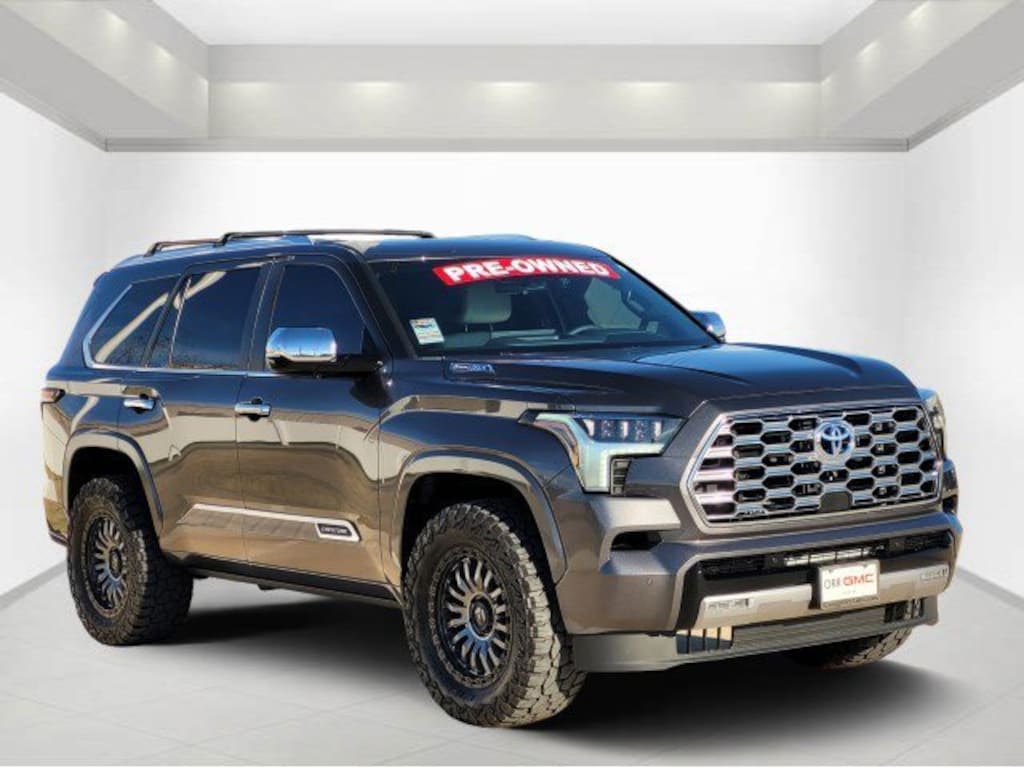 This 2024 Toyota Sequoia comes equipped with Capstone (Automatic Power Extending Running Boards, Head Up Display (HUD), and Heated Power Auto-Dimming Outside Mirrors), V6 Hybrid, 10-Speed Automatic, 4WD, Navigation system: Drive Connect (1 year trial) includes Cloud Navigation with real time traffic and Google POI, 14 Speakers, 3.31 Axle Ratio, 3rd row seats: split-bench, 4-Wheel Disc Brakes, ABS brakes, Air Conditioning, Alloy wheels, AM/FM radio: SiriusXM, Anti-whiplash front head restraints, Apple CarPlay/Android Auto, Auto High-beam Headlights, Auto tilt-away steering wheel, Auto-dimming door mirrors, Auto-dimming Rear-View mirror, Automatic temperature control, Brake assist, Bumpers: body-color, Compass, Delay-off headlights, Driver door bin, Driver vanity mirror, Dual front impact airbags, Dual front side impact airbags, Electronic Stability Control, Emergency communication system: Safety Connect (10-year trial), Exterior Parking Camera Rear, Front anti-roll bar, Front Bucket Seats, Front Center Armrest w/Storage, Front dual zone A/C, Front fog lights, Front reading lights, Front wheel independent suspension, Fully automatic headlights, Garage door transmitter: HomeLink, Genuine wood door panel insert, Headlight cleaning, Heads-Up Display, Heated & Ventilated Front Seats, Heated door mirrors, Heated front seats, Heated rear seats, Heated steering wheel, Illuminated entry, Knee airbag, Leather Shift Knob, Leather steering wheel, Low tire pressure warning, Memory seat, Occupant sensing airbag, Outside temperature display, Overhead airbag, Overhead console, Panic alarm, Passenger door bin, Passenger vanity mirror, Power door mirrors, Power driver seat, Power Liftgate, Power moonroof, Power passenger seat, Power steering, Power windows, Premium audio system: JBL, Radio: JBL Premium Audio System, Rain sensing wipers, Rear air conditioning, Rear reading lights, Rear seat center armrest, Rear window defroster, Rear window wiper, Reclining 3rd row seat, Remote keyless entry, Security system, Semi-Aniline Leather Seat Trim, Speed control, Speed-sensing steering, Split folding rear seat, Spoiler, Sport steering wheel, Steering wheel mounted audio controls, Tachometer, Telescoping steering wheel, Tilt steering wheel, Traction control, Trip computer, Turn signal indicator mirrors, Variably intermittent wipers, Ventilated front seats, Ventilated rear seats, Voltmeter, and Wheels: 20 Machined-Finish Black Alloy. CARFAX One-Owner. V6 Hybrid, 10-Speed Automatic, 4WD, Automatic Power Extending Running Boards, Capstone, Head Up Display (HUD), Heated Power Auto-Dimming Outside Mirrors, Navigation system: Drive Connect (1 year trial) includes Cloud Navigation with real time traffic and Google POI.